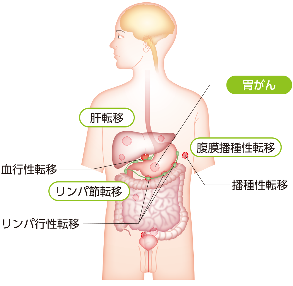 手術療法で目に見える範囲のがんをすべて取り除いた後や術後補助化学療法を行った後、治療を行った部位などにがんが再びあらわれることを「再発」といいます。また、それまでの治療の有無とは関係なくがん細胞がリンパ液や血液の流れにのって別の臓器に移動し、そこで大きくなることを「転移」といいます。胃がんでは進行により、主に肝臓、リンパ節、腹膜に転移がみられることがあります*19。