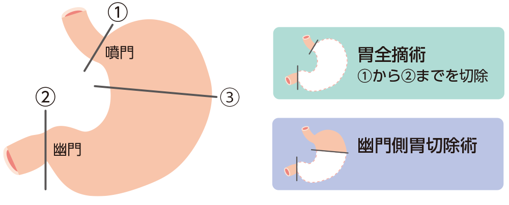 早期胃がんでは、腫瘍の端から2cm以上の距離を確保して切除します。進行胃がんでは、限局型で3cm、浸潤型では5cm以上の距離を口側に確保して切除するようにします。