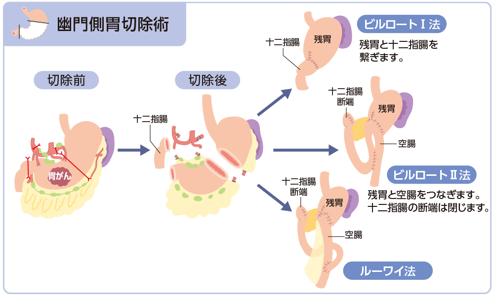 手術療法では、がんと胃の一部またはすべてを取り除きます。同時に胃の周囲のリンパ節を取り除くリンパ節郭清や、食べものの通り道をつくり直す再建手術(消化管再建)も行われます*5。