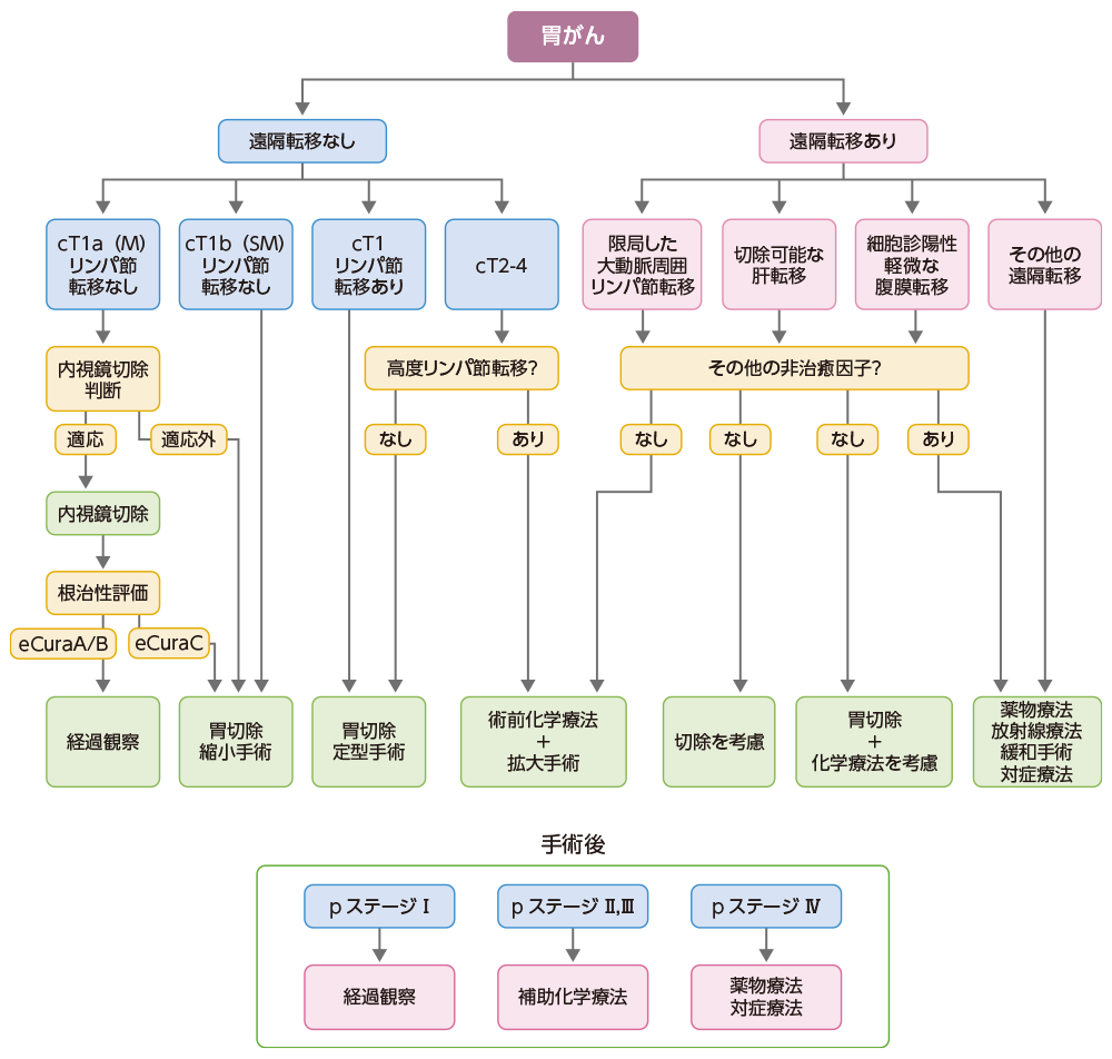 胃がんの治療法は進行度に応じて日常診療で推奨される治療法選択のアルゴリズムにしたがって選択されます。